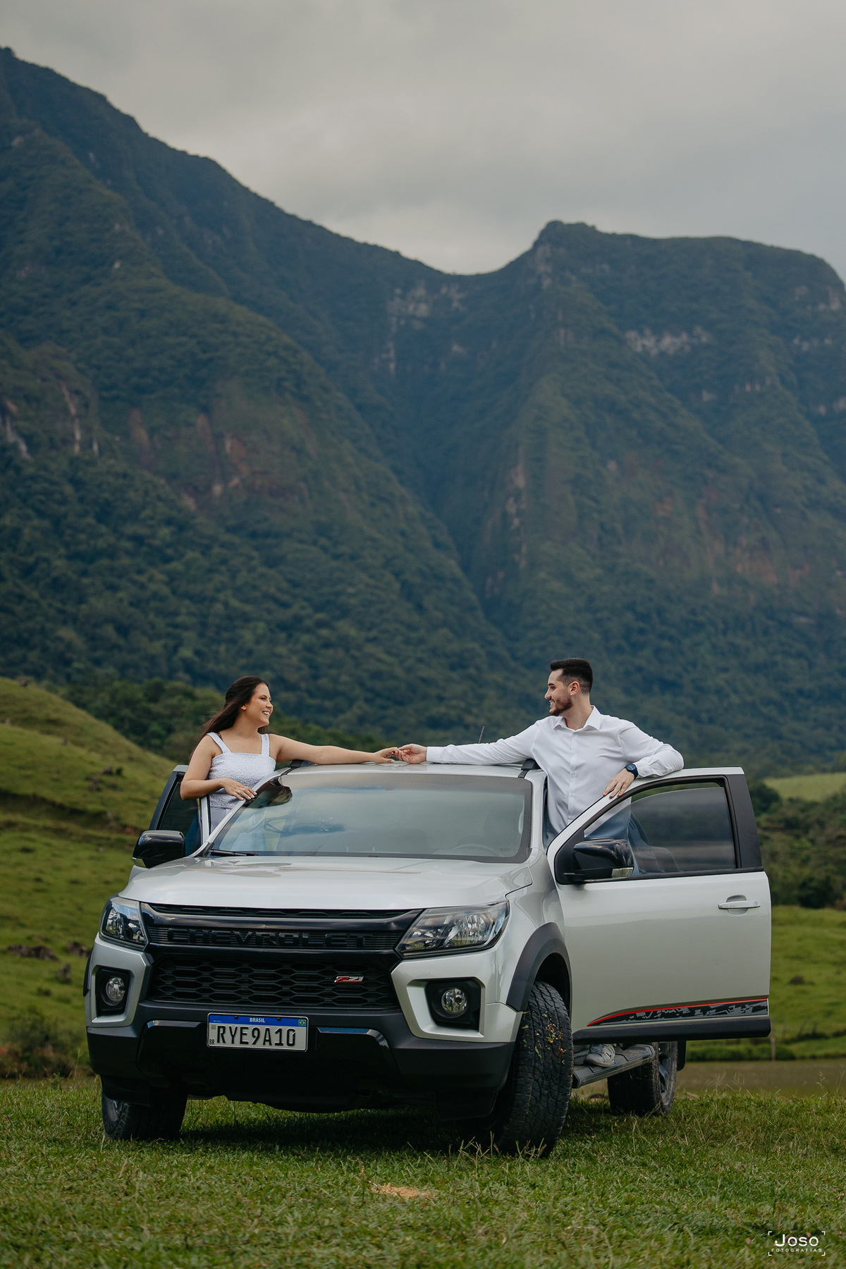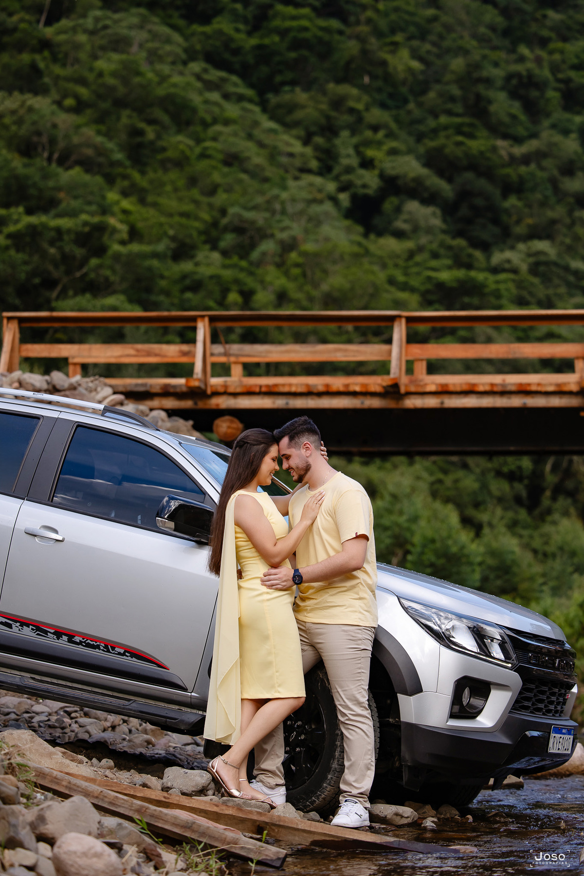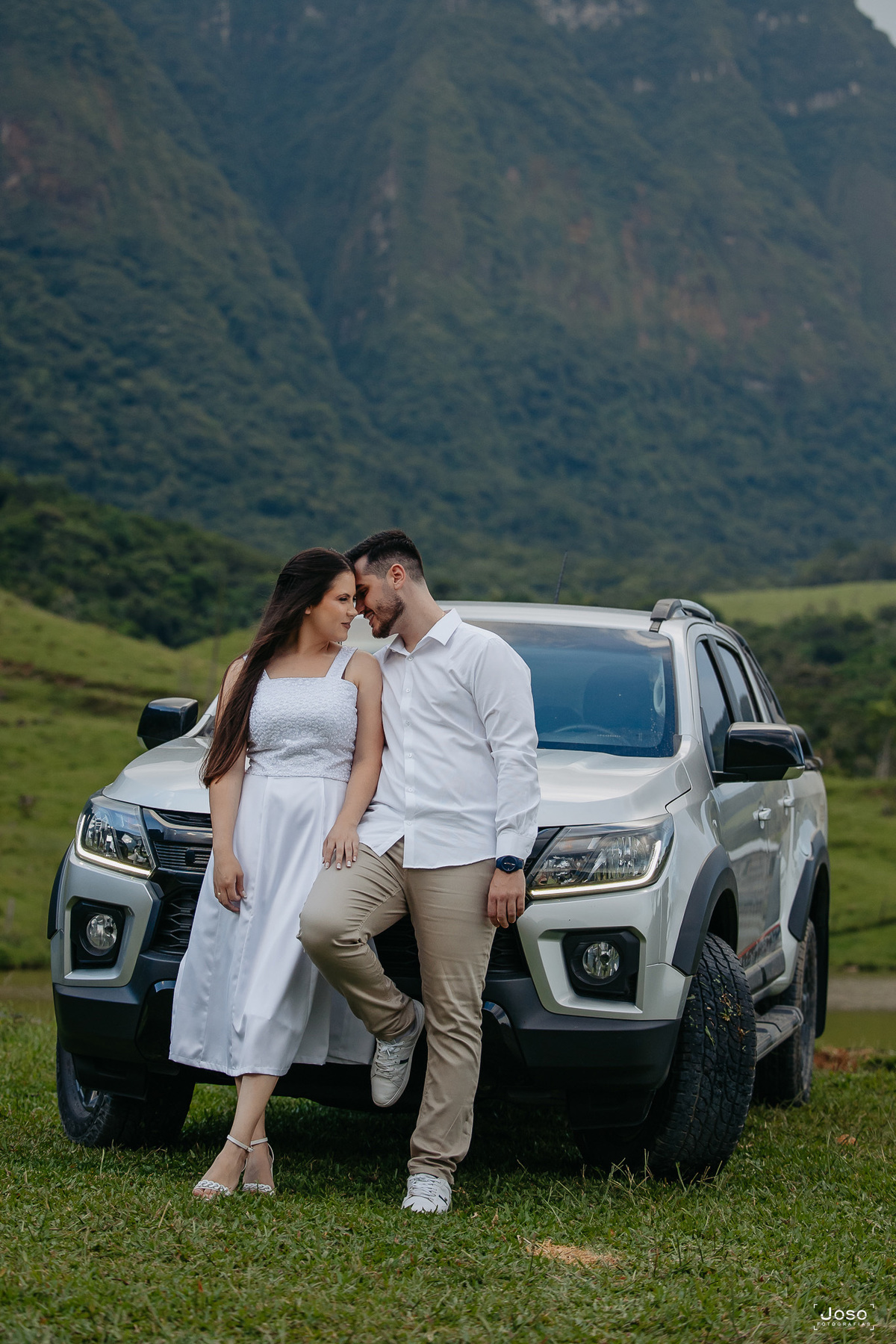 O noivo Gabriel, animado e cheio de orgulho, não escondia o brilho nos olhos ao posar com a caminhonete, detalhe, ele é parece adorar carros, mas apaixonado mesmo, ele é pela Jheni. Que com seu sorriso leve, completava a cena com delicadeza e cumplicidade.